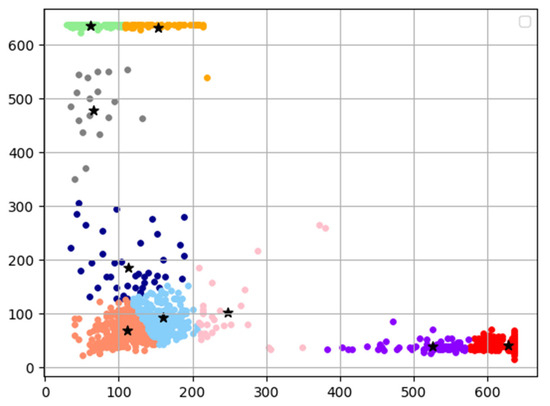In this research, applying k-means clustering to our training dataset resulted in the identification of nine anchor box sizes, which are (117, 62), (123, 99), (162, 79), (618, 35), (164, 147), (614, 41), (43, 621), (626, 59), and (85, 619). These numbers represent the anchor frame dimensions, with the first number in parentheses representing the length of the anchor frame and the second number representing the height of the anchor frame. The calculation results are shown in Figure 5, where the x-axis and y-axis represent the width and height of the ground truth bounding box, respectively. Each color represents one cluster, and “★” represents the centroid of each cluster after clustering. Because there are 9 sets of anchors in the algorithm, there are 9 centroid points in the figure.