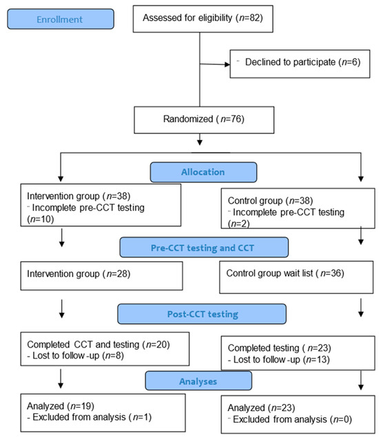 Of the initial 28 participants assigned to the intervention group, two dropped out after the initial CCT session, six dropped out after two to four CCT sessions, and one did not complete the post-CCT neuropsychological testing, resulting in 19 subjects who completed the CCT and both pre- and post-CCT testing. In the control group, 13 participants did not attend the second testing session, resulting in a total of 23 participants in the control group (see Figure 1).