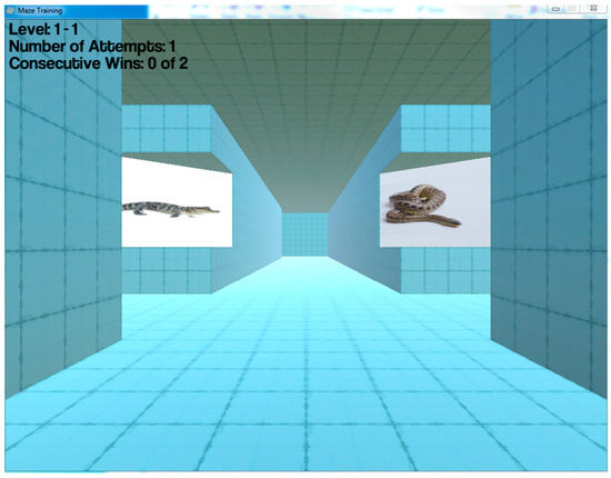 The CCT task was presented from a first-person perspective and consisted of a series of interconnected hallways and alleys, with three available paths at each intersection or decision point. Some hallways led to the goal area, indicated by a trophy, while others led to dead ends. At each decision point (intersection), a pair of nonverbal cues (e.g., pictures of animals) was displayed at opposite corners. Participants were instructed to select the correct path as quickly and efficiently as possible, aiming to move toward the goal area (represented by a trophy picture) while staying in the center of the path. Upon reaching the goal area, participants were “transported” back to the starting point to begin another learning trial for the same virtual environment. Participants began CCT with maze navigation featuring one intersection and progressed up to environments with nine intersections.