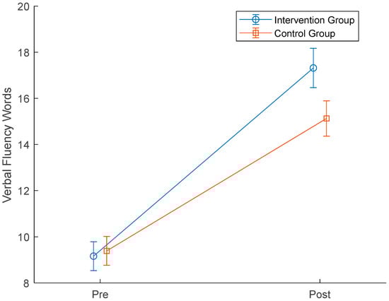 Mixed ANOVAs did not show any significant main effects for the group (p > 0.14) across any of the outcome variables. However, the mixed ANOVA for the Verbal Fluency Letter test showed that there was a significant interaction effect between time and group f [F(1,40) = 4.387, p = 0.043, η2 = 0.099] (See Figure 3). A subsequent post hoc analysis indicated a significant improvement in both groups (p < 0.001), though there was a significant difference between the post-CCT score for the groups (p = 0.05), demonstrating that participants in the intervention group significantly increased their performance on the Verbal Fluency Letter test more than participants in the control group (from 9.16 to 17.32 vs. 9.39 to 15.13, respectively).