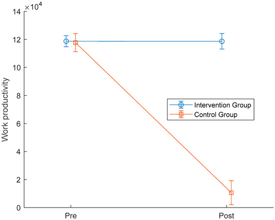 Line graph of the average productivity for participants in the intervention group (blue color) and control group (orange color) for pre- and post-CCT (error bars represent standard error of the mean).