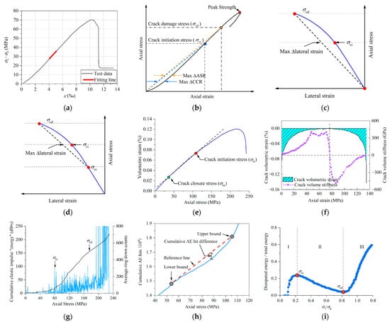 Deformation and crack propagation processes in rock are broadly divided into four stages: crack closure, elastic deformation, stable crack growth, and unstable crack growth [,,,]. These four stages are distinguished based on four stress thresholds: crack closure stress (), crack initiation stress (), and crack damage stress (). Crack closure stress is related to the density and geometric characteristics of existing cracks in rocks []. Crack initiation stress represents the in situ spalling strength of the surrounding rock in tunnel, indicating the generation of new cracks and termination of the elastic deformation stage [,]. When stress exceeds the crack initiation stress, the crack propagates stably, parallel to the maximum principal stress direction []. When the stress exceeds the crack damage stress, the energy released during crack propagation leads to further propagation of the cracks, that is, unstable crack propagation [,]. Martin and Chandler suggested that the crack damage stress threshold indicated long-term strength, above which failure of the rock specimen occurred if the test was run for a sufficiently long time []. Therefore, a reasonable determination of crack stress thresholds is crucial for understanding the process of rock damage [,].