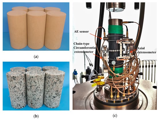 The step loading and unloading tests were conducted using the MTS815 servo-hydraulic testing machine (Figure 1c). As shown in Figure 2, an axial extensometer (50 mm scale) and a chain-type circumferential extensometer were used for the displacement measurements. The AE signal was monitored using a PCI Express-8 AE system and four Micro30 sensors. The threshold value of the AE acquisition system, gain value of the preamplifier, and sampling frequency were set to 37 dB, 40 dB, and 5 million samples per second, respectively.