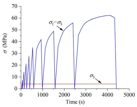 Step loading and unloading experiments were performed to obtain the strain and plastic strain responses of granite and siltstone simultaneously. Many experimental results have shown that when the number of cycles of triaxial step loading and unloading is small, cyclic loading has a slight effect on the strength and deformation characteristics [,]. Hence, the stress increment in each step was designed based on the estimated peak strength to sure approximately 10 cycles before the peak stress (Table 1). Figure 3 shows typical stress paths in the triaxial step loading and unloading tests. The experimental details are as follows: