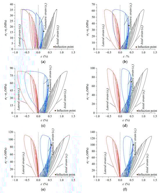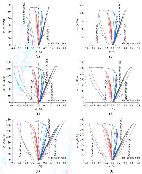 Stress–strain curves of granite under triaxial step loading and unloading tests for different values of : (a) 0 MPa, (b) 4 MPa, (c) 8 MPa, (d) 12 MPa, (e) 16 MPa, and (f) 20 MPa.