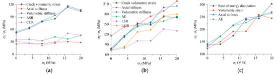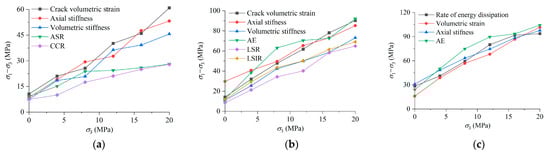 Crack stress thresholds for siltstone: (a) crack closure stress, (b) crack initiation stress, and (c) crack damage stress.