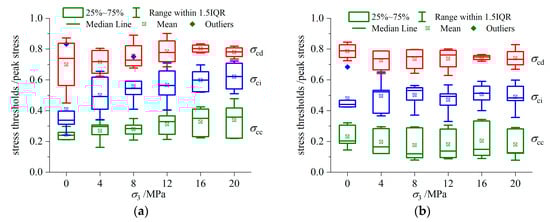 When the confining pressure is 0–4 MPa, the compaction of siltstone before deviatoric stress loading is in a small degree. The plastic compaction caused by hydrostatic pressure during deviatoric stress loading continues slowly even after the crack closure stage [], resulting in a longer linear stage of the stress–axial strain curve of siltstone compared with that under higher confining pressure. Consequently, the axial stiffness method produces a higher compared to other methods, resulting in larger outliers in Figure 8a. Granite shows a small plastic compaction and deformation modulus increasement. However, when the confining pressure is 0–4 MPa, the axial plastic strain generated before the peak is extremely small, making it difficult to determine the critical point of the stress–axial strain curve from linear to nonlinear. This led to the of granite calculated by the axial stiffness method to become higher than that of other methods and results in larger outliers, as shown in Figure 8b. The stress–lateral strain curves of siltstone specimens and granite specimens under high confining pressure show significant nonlinearity during the crack closure stage, causing the reference line slope of the LSR method to be smaller than that of the linear stage. This results in the obtained by the LSR method being less than the actual [], and the lower bound of in Figure 8 being significantly lower than its mean value.