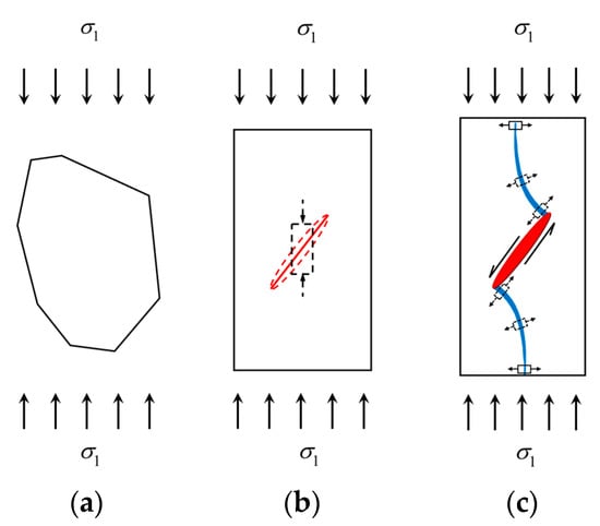 Rocks are natural geological materials that are vital in various engineering applications, including mining, civil engineering, and nuclear waste disposal. During construction and operation, rocks are often subjected to stress disturbances, such as excavation and vibration [,]. Hence, their crack propagation stress thresholds are important mechanical properties for engineering applications.