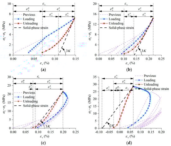 Stress–strain curves of siltstone under triaxial step loading and unloading tests for different values of : (a) 0 MPa, (b) 4 MPa, (c) 8 MPa, (d) 12 MPa, (e) 16 MPa, and (f) 20 MPa.