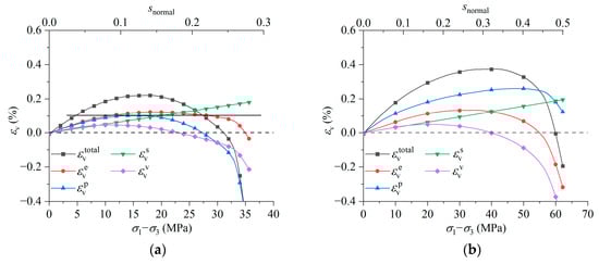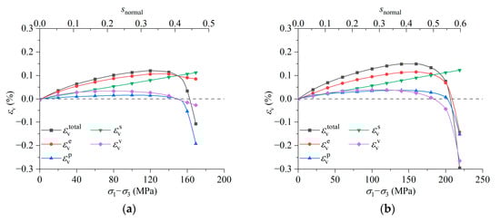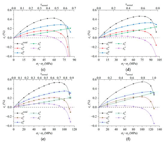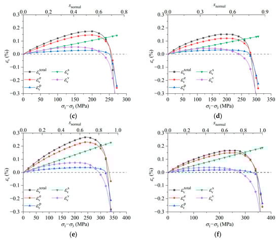 Volumetric strain decomposition of siltstone for different values of : (a) 0 MPa, (b) 4 MPa, (c) 8 MPa, (d) 12 MPa, (e) 16 MPa, and (f) 20 MPa.