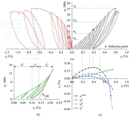 During the crack closure stage, there are a few cracks in the rock, and the volumetric strain is mainly generated by solid-phase deformation and crack closure. Therefore, the stress–axial strain curve exhibits a concave curve with a positive slope. As the load increases, the elastic expansion along the transverse direction increases, thereby increasing the slope of the stress–volumetric strain curve during the unloading stage.