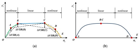 To quantitatively determine the stationary stage of the gas-phase volumetric strain curve, the gas-phase volumetric strain before the damage stress is generalized into three segments: nonlinear segment OB, linear segment BC, and nonlinear segment CD. The nonlinear segment could be quadratically generalized into bilinear segments (OA–AB and CD–DE). Connecting OB, AC, BD, and CE as reference lines, points A, B, C, and D correspond to the maximum difference between the gas-phase volumetric strain and the reference line (Figure 14a).