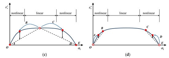 - Termination judgment: The calculation is terminated if the stress corresponding to points A, B, C, and D changes by less than 0.1 MPa compared to its previous value. Otherwise, steps (b) and (c) are repeated. The final positions of points B and C correspond to crack initiation and damage stresses (Figure 14a).