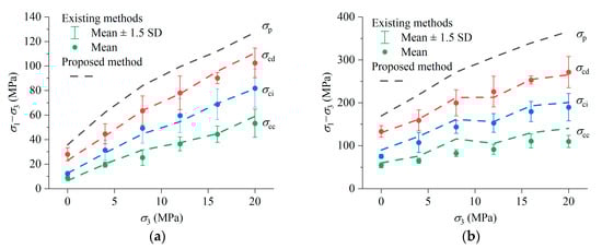 The , , and of siltstone and granite obtained by the proposed method are close to the mean values of the results obtained by existing methods and exhibit similar trends. Furthermore, the differences between the proposed method results and the mean values of the existing method results are mostly within 1.5 times the standard deviation, indicating that the proposed characteristic stress calculation method provides reasonable results.