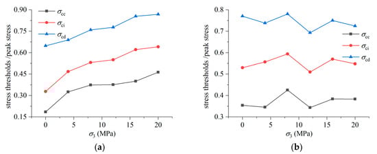 Relationship between crack stress thresholds and peak stress: (a) siltstone and (b) granite.