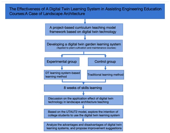 To address the limitations of case studies, this research employs a quasi-experimental design to compare the effectiveness of digital-twin-assisted teaching with traditional teaching methods by dividing participants into an experimental group and a control group. The specific research methods are as follows: First, this study developed a preliminary framework for a project-based-course teaching model based on digital twin technology and created a digital twin landscape learning system tailored to the actual needs of the course. The primary functions of this system include providing a virtual training environment, offering real-time feedback and guidance, delivering an immersive learning experience, and facilitating data-driven personalized learning paths. Second, using the “Courtyard Landscape Greening Project” from the “Plant Cultivation and Maintenance” course as an example, this study designed and developed a project-based teaching approach based on the digital twin landscape learning system. The effectiveness of the teaching was evaluated through a combination of surveys and interviews. Finally, based on the results of the data analysis, this study discusses the application effects of digital twin technology in landscape architecture education. The research is grounded in the UTAUT2 model and explores the factors influencing students’ intention to use similar digital twin learning systems (refer to Figure 3).