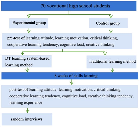 To evaluate the effectiveness of the digital twin learning system in landscape architecture education, this study designed a quasi-experiment. Pretests indicated no significant differences between the experimental and control groups in terms of learning attitudes, motivation, and inclination toward innovative thinking. Students in the experimental group also underwent pretests on cognitive load and training on how to use the digital twin learning system. The intervention phase of the experiment lasted for 8 weeks, comprising a total of 16 sessions. During this period, different teaching methods were implemented for the two groups, with the experimental group learning through the digital twin learning system, while the control group received traditional landscape architecture teaching guidance. After the intervention, post-tests were conducted on both groups of students. The specific experimental process is illustrated in Figure 4.