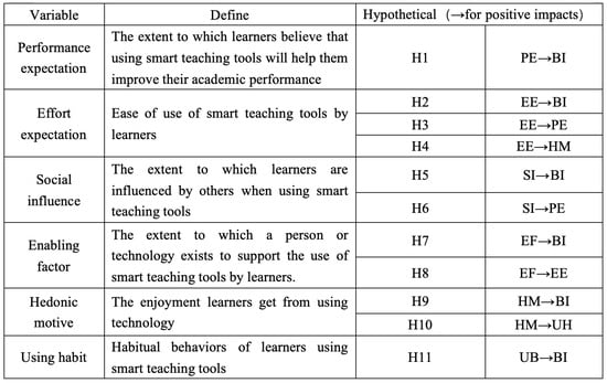 Performance expectations were shown to have a strong relationship between intention to use a particular system most of the time, and this results in H1; the TAM model hypothesizes that perceived ease of use (equivalent to effort expectancy) influences perceived usefulness (equivalent to performance expectancy) in an information system. Perceived ease of use in the model affects people’s enjoyment of using smart tools [84], and this results in H2, H3, and H4; the environment in which a student lives can have an impact on his or her intention to use smart teaching tools, i.e., there is a causal relationship between social influence and intention to use [85]. When learners perceive stronger social influence, they will be more inclined to use smart teaching tools. Also, they will feel that smart teaching tools can improve their learning efficiency, and this results in H5 and H6; in the TAM model, perceived usefulness is determined by a combination of perceived ease of use and external variables, with perceived ease of use being determined by external variables. The contributing factors in this study are external variables [83], and this results in H7 and H8; in this paper, habit of use is defined as the habitual behavior of university students in using smart teaching tools [86], and this results in H11. In summary, the research modeling diagram is as follows in Figure 6.