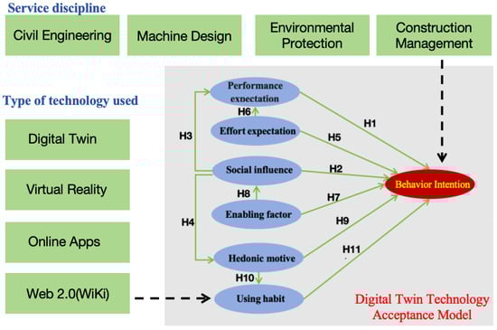 The UTAUT2 model is innovative in the study of technology acceptance, particularly in the field of e-learning technologies [83]. This paper adopts the UTAUT2 model as the basis to examine students’ intentions to use digital twin learning systems. Since students do not need to invest financial capital to use digital twin learning systems, the price value construct is excluded from the model. Additionally, to gain a better understanding of students’ intentions to use digital twin learning systems, this study investigates the relationships between relevant variables based on the UTAUT2 model. The definitions and assumptions of the factors are shown in Figure 5.