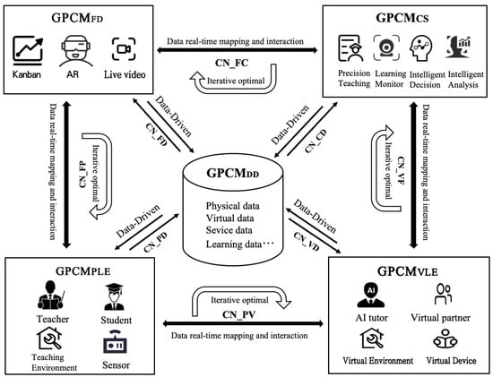 Equation: Dp is mainly used to describe the physical elements that constitute the physical teaching space, such as the equipment, garden space, lighting, and other physical-element attribute data, as well as the dynamic process data that can reflect the operating state of the physical teaching space, the dynamic process data through the sensors, device interfaces, embedded acquisition cards, Internet of Things technology, etc.; Dv can represent the data related to the model of the physical teaching space (including the geometric model, physical model, behavioral model, rule model, etc.). Dv can represent the data related to the physics-teaching-space model (including the geometric model, physical model, behavioral model, rule model, etc.); Ds mainly includes models, algorithms, decision rules, database operations, etc., required for front-end display, as well as modal process data, human–computer interaction data, etc.; Dl includes expert knowledge, industry standards, commonly used algorithms, commonly used databases, commonly used API interfaces, and commonly used model-construction methods.