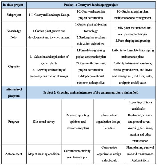 The selection and design of projects play a crucial role in the course’s project-based transformation. Projects should ideally originate from real-life scenarios in frontline enterprises as they are more aligned with practical work situations, providing authentic contexts that stimulate student engagement and facilitate knowledge transfer. This approach enhances students’ abilities to solve real-world problems and enables them to adapt more quickly to job roles after graduation. Project selection should aim for comprehensive coverage of the entire course curriculum. Taking the “Landscape Plant Cultivation and Maintenance” course as an example, a suitable project for in-class activities is the landscaping of a small courtyard, which is conducive to practical implementation in the training ground. Teachers will allocate a 4 × 5 m area on campus for each student group, replicating a real-life campus environment to determine the location and size of the courtyard. Working in groups, students will undertake the task of designing the courtyard landscaping, followed by the formulation of a landscaping plan and procurement planning for plant materials (with an emphasis on top-level procurement planning). Upon finalizing the plan, students will proceed with the landscaping construction and ultimately be responsible for maintenance and survival.