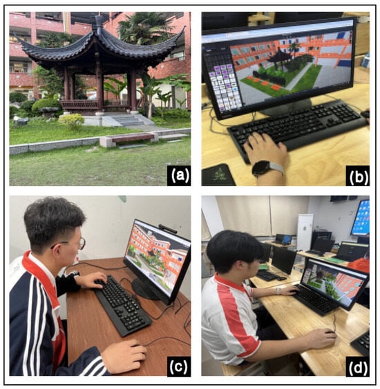 (a) Physical landscape architecture drawing; (b) Students use the digital twin learning system to construct virtual landscape buildings; (c,d) Students co-design projects on the digital twin learning system.
