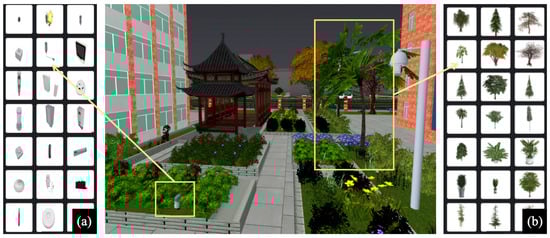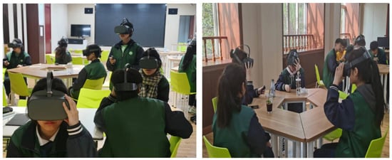 In the courtyard greening plant maintenance and management project, digital twin technology integrates the actual courtyard environment with digital models, enabling digital management and the simulation of plant-growth environments. Initially, students use the digital twin learning platform to practice courtyard landscape design. Subsequently, they select appropriate sensors and plants based on the project’s specific needs and the environmental conditions to be monitored. The system offers a wide range of sensors that measure various parameters, such as soil moisture, temperature, humidity, and light intensity. For sensor selection (Figure 13a), students can browse a library containing detailed specifications and usage scenarios. For instance, if a student is researching the impact of soil moisture on plant growth, they can choose soil moisture sensors with varying sensitivities and ranges. For plant selection (Figure 13b), the system provides a comprehensive database of plants, detailing their growth requirements, optimal environmental conditions, and potential challenges. Students can select suitable plants according to project goals and simulate their growth under different conditions. These sensors are connected to the digital twin system, allowing students to monitor plant-growth conditions and environmental factors in real time and receive immediate maintenance guidance and optimization suggestions. Throughout the process, students learn about plant-growth characteristics, pest and disease control, and fertilization and irrigation techniques and participate in actual maintenance work. Additionally, the digital twin technology offers teachers the ability to track students’ practical operations and learning progress in real time, enabling them to provide personalized guidance and support. By leveraging digital twin technology, students can evaluate and compare the feasibility of different design schemes, helping them consider and optimize plant-maintenance management strategies from various perspectives. Meanwhile, the system incorporates virtual reality (VR) technology, allowing students to immerse themselves in the plant-growth environment (Figure 14). With VR equipment, students can virtually “walk” through their designed landscapes, observing the plants’ responses to different environmental conditions in real time. This immersive experience helps students gain a deeper understanding of the plant’s lifecycle and the impact of various factors on their growth. VR technology also enhances the learning experience by providing a realistic and engaging way to visualize complex concepts.