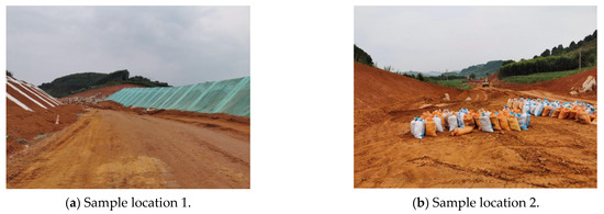 The expansive soil utilized in this study was sourced from the construction site of the Chong’ai Expressway (Section K23+800) in Ningming County, Chongzuo City, Guangxi Zhuang Autonomous Region (Figure 1). This particular construction section is notorious for its unfavorable geological conditions associated with expansive soil. To accurately represent the engineering conditions and geological findings, two sampling points were designated within the K23+800 road section. The soil samples were collected from the test points at a depth of 0.1–0.5 m. They had an initial moisture content of approximately 35% and an initial dry density ranging from 1.20 to 1.46 g/cm3.