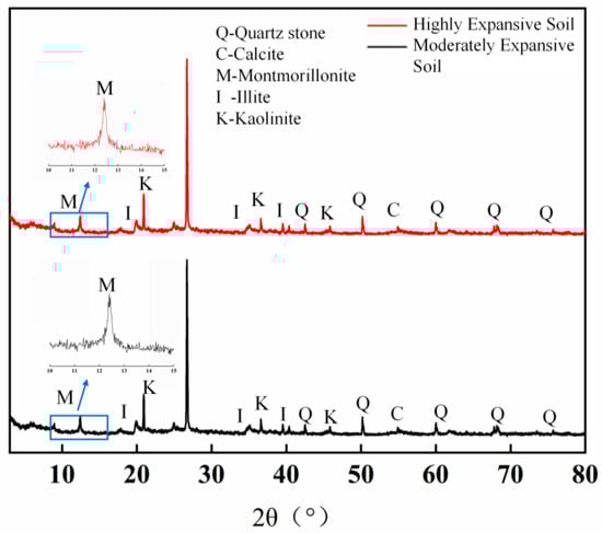 Smectite, illite, and kaolinite, among other secondary minerals, are formed through chemical weathering. These fine mineral particles are the primary constituents of clay minerals and significantly influence the engineering properties of soil. Utilizing a Smart-lab XRD analyzer, X-ray diffraction analysis was performed on samples of highly expansive soil, as depicted in Figure 2. The findings indicate that quartz, smectite, illite, kaolinite, and trace amounts of calcite are the predominant minerals, with clay minerals comprising a substantial fraction. Smectite exhibits the highest hydrophilicity, capable of absorbing substantial water molecules within its interlayers. Illite, with a crystalline lattice and interlayer structure akin to smectite, is less hydrophilic. Kaolinite’s strong interlayer bonding impedes water molecule penetration, resulting in lower hydrophilicity compared to illite. Consequently, the concentration of smectite and illite is notably elevated in highly expansive soil and rock. The clay mineral’s structural unit in expansive soil is composed of two SiO2 layers and one Al2O3 layer. The weak interlayer bonding facilitates rapid water molecule infiltration, leading to internal crystal lattice expansion and subsequent rapid disintegration of the soil, which is a key mechanism in the development and progression of fissures.