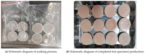 - As per the experimental specifications, uniformly distribute the dried expanded soil onto the container tray. Apply Vaseline to the basin of the stainless steel container to prevent it from constraining crack development at the bottom of the test block. Then, gradually and uniformly add water using a small spray bottle until reaching the predetermined value, ensuring thorough mixing with the soil. Following configuration, seal the sample in a plastic bag for 48 h to guarantee consistent moisture distribution, as depicted in Figure 3;