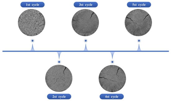 The specific steps of the wet–dry cycle test are as follows: First, the expansive soil samples sealed in plastic bags are placed in a constant temperature oven for drying. The oven temperature is set to 35 °C based on the meteorological data of the soil collection site on the Chong’ai Expressway in Guangxi. Regularly measure the samples’ weight to determine changes in moisture content. Considering that the shrinkage limit moisture content of the expansive soil specimens employed in this study is 12%, further data recording ceases once the moisture content falls below this threshold. Consequently, soil shrinkage becomes notably challenging at this juncture, with crack formation essentially halting, marking the conclusion of a single dry cycle process. Subsequently, utilize a digital camera to capture photographs of the samples’ surface and sides. Then, reassemble the samples within a ring cutter, with permeable paper and a 5 mm-thick permeable stone placed both above and below the samples. Secure the assembly using a G-clamp and subsequently subject it to saturation by placing it in a vacuum saturation device. Finally, after maintaining the samples under constant conditions for 24 h and completing the saturation process, remove them and position them back in the drying oven. Capture additional photographs when the moisture content reaches approximately 12%, marking the beginning of the second dry–wet cycle. Repeat these steps for the third to fifth dry–wet cycles. Ultimately, the diagram depicting the change in crack morphology, as illustrated in Figure 4, is acquired.