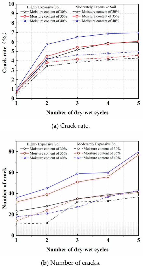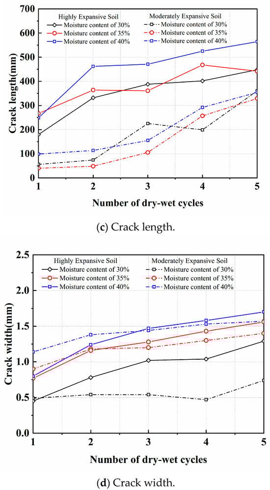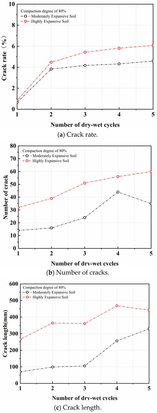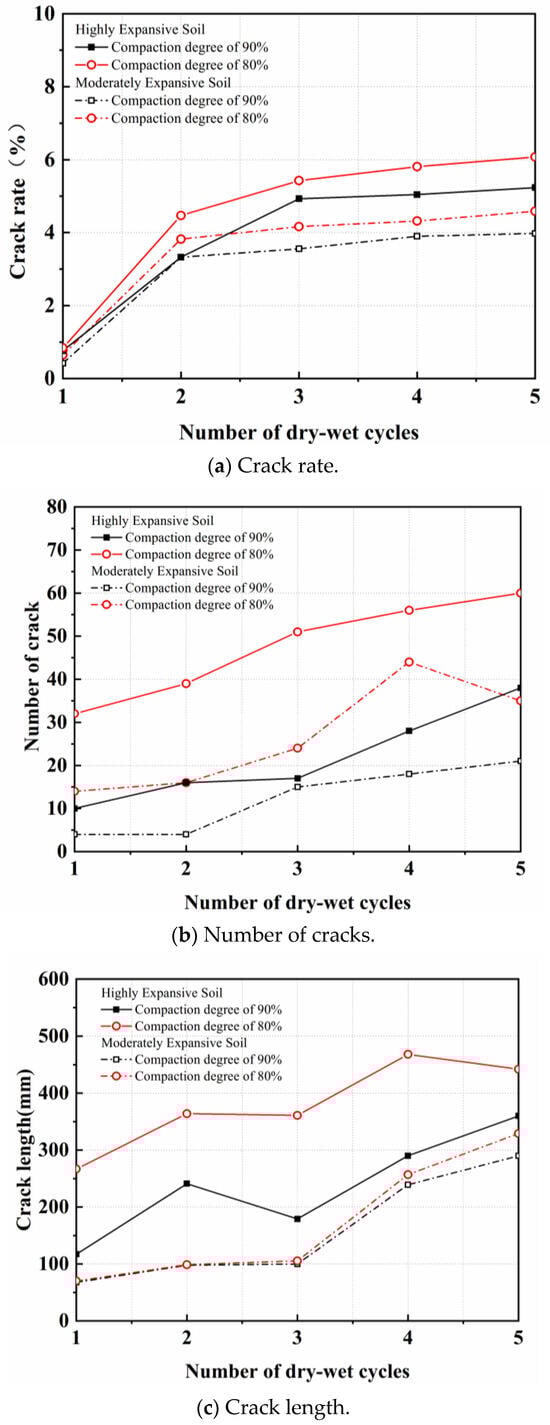 (1) The evolution of cracks in expansive soil exhibits an initial increase followed by stabilization with increasing wet–dry cycles, a phenomenon more pronounced in highly expansive soils. As cycles progress, the tensile forces from the surrounding soil drive lateral crack expansion, with average width increments of 0.5 mm for moderately expansive and 0.8 mm for highly expansive soil samples;
