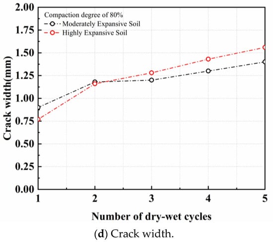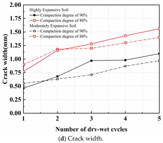 Figure 8b demonstrates the variation curves of the total crack counts of different compacted expansive soil specimens with the number of dry–wet cycles. Unlike the crack ratio, compactness significantly influences the total crack count. In comparison to the specimen with 80% compactness, taken as the reference value, increasing compactness by 10% results in a reduction in the total crack count of moderately expansive soil samples varying from 37.5% to 71.4%, and the decrease is from 36.7% to 68.8% for highly expansive soil samples. With 80% compactness, the total crack count generally increases with the number of dry–wet cycles for moderately and highly expansive soil samples. In contrast, the variation in total crack count of specimens with 90% compactness after the first and second dry–wet cycles is insignificant, indicating that increasing compactness limits the generation and extension of cracks in the expansive soil samples (Figure 8c). The total crack length of moderately expansive soil samples is minimally affected by compactness, with noticeable differences observed only after multiple dry–wet cycles. In contrast, the total crack length of highly expansive soil doubles under 80% compactness compared to 90% compactness. The number of dry–wet cycles affects the average crack width of the soil samples in relation to compactness. The crack width of the 80% compactness specimen is significantly higher than that of the 90% compactness specimen, with the former being more than 1.5 times higher. As the number of dry–wet cycles increases, the difference in average crack width between the two specimens gradually grows, indicating that decreased compactness intensifies the enhancement of the shrinkage and swelling characteristics of the expansive soil during multiple water absorption and desorption processes.