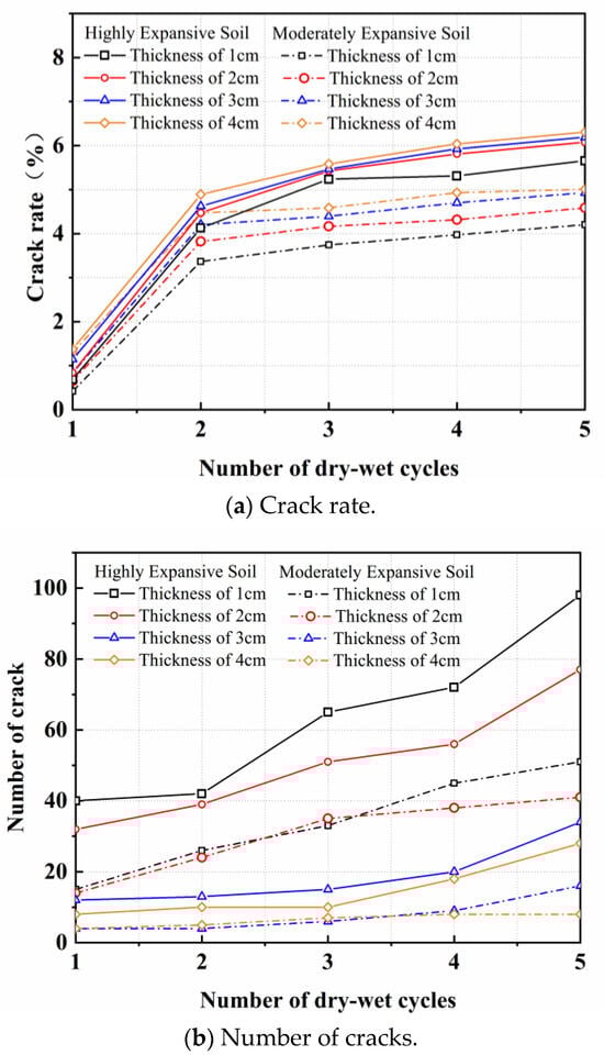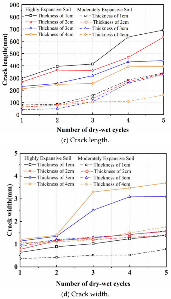 To investigate the effect of thickness on crack development in expansive soil, specimens of medium and highly expansive soil were prepared with thicknesses of 1 cm, 2 cm, 3 cm, and 4 cm. The crack development characteristics of the specimens were analyzed after multiple dry–wet cycles. Figure 9 illustrates the curves of the basic morphological parameters of the cracks.