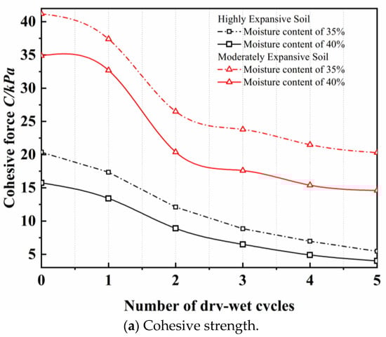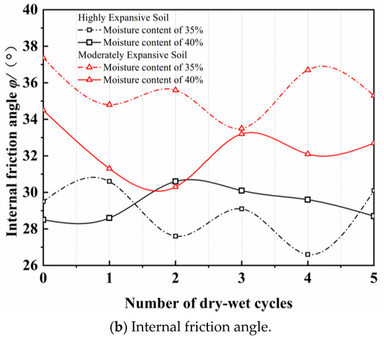 Figure 10 presents the variation curves depicting the cohesive strength (c) and internal friction angle (φ) of expansive soil specimens with different initial water contents subjected to dry–wet cycles. As the number of dry–wet cycles increases, the cohesive strength of the expansive soil demonstrates a significant nonlinear decrease. For instance, considering a moderately expansive soil specimen with an initial water content of 35%, the cohesive strength decreases from the initial value of 41.2 kPa to 20.3 kPa after the fifth cycle, representing a 50% reduction. In contrast, a strongly expansive soil specimen with the same initial water content of 35% exhibits a relatively lower cohesive strength of 5.45 kPa, which corresponds to approximately 30% of its initial value. Conversely, the internal friction angle of the expansive soil shows a relatively low sensitivity to dry–wet cycles. The internal friction angle of the moderately expansive soil specimen decreases steadily as the number of dry–wet cycles increases, reaching its minimum value of 33.5° after the third cycle. In comparison, the internal friction angle of the strongly expansive soil specimen remains relatively constant, ranging between 26.6° and 30.1° (Figure 10b).