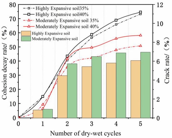 The influence of the initial moisture content on the strength degradation of expansive soil is of significance. To quantitatively describe the degradation law of strength parameters for varying initial moisture contents, the cohesion index of the initial state of the expansive soil sample is used as the baseline. The cohesion degradation rate index is determined by calculating the ratio of the difference between cohesion after cyclic wetting and drying to the baseline value. Figure 11 presents the variation curve of the cohesion degradation rate for strongly expansive soil under different numbers of cyclic wetting and drying and different initial moisture contents. The results indicate that increasing the initial moisture content enhances the degree of cohesion degradation for both medium and strong expansive soil samples. After five cycles of wetting and drying, the cohesion of the medium expansive soil sample with an initial moisture content of 40% decreased from 34.9 kPa to 14.6 kPa, corresponding to a decrease of 58.2%. However, under the same conditions, the cohesion of the medium expansive soil sample with an initial moisture content of 35% only decreased by 50.7%. With an increase in soil expansiveness, the influence of initial moisture content on strength degradation gradually diminishes.