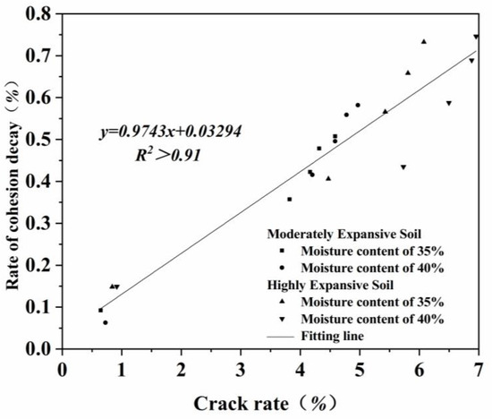 To gain further insights into the relationship between crack development and strength degradation in expansive soil, a linear fit is conducted to determine the decaying rate of cohesion for different crack ratios of expansive soil. The crack ratio of expansive soil is the primary quantitative evaluation parameter used to measure the cracking process of expansive soil. This parameter provides an accurate representation of the development and expansion process of micro and main cracks in the soil. The fitting results, as demonstrated in Figure 12, indicate a clear linear increase (R2 > 0.91) in the decay rate of cohesion with the rise in crack ratio for expansive soil. This suggests that the degradation of strength in expansive soil is primarily attributed to the damage inflicted on the soil structure due to the development of cracks in the specimens. Using crack ratio as a controlling indicator to depict the degradation law of expansive soil strength under wetting–drying cycle conditions is reasonably justified.