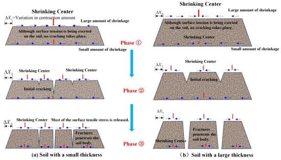 Existing studies have demonstrated that environmental factors [23] and the level of sectional friction caused by bottom constraint [24] influence the swelling and shrinkage deformation of expansive soil. In this experiment, we rigorously controlled these factors to investigate their impact on the cracking of expansive soil. To minimize the influence of bottom constraint on crack development, stainless steel trays were utilized as containers. These trays have highly smooth bottom surfaces, resulting in minimal frictional force. Based on the volume shrinkage characteristics of the specimens, the overall crack development in expansive soil can be categorized into three stages (see Figure 13). It is noteworthy that the location of the shrinkage center varies among specimens in different stages. Additionally, differences in the shrinkage (different thicknesses represented by Figure 9) before cracking in the expansive soil specimens become evident, and are influenced by the thickness of the specimen, with greater thickness corresponding to more significant shrinkage differences before cracking (ΔX4 > ΔX1). In the second stage, preliminary cracking occurs in the soil, thereby alleviating the tensile stress present in the surface soil layers. Consequently, the shrinkage amounts of specimens with different thicknesses gradually converge (ΔX5 > ΔX2). Thinner specimens tend to generate a greater number of cracks during initial cracking, which in turn leads to changes in the location of the shrinkage center. In the third stage, once cracking advances to stage three, the cracks have essentially interconnected. In thicker expansive soil specimens, the crack openings are wider but fewer in number, whereas in thinner specimens, the crack openings are narrower but more abundant. Notably, the development of cracks dissipates the tensile stress on the soil surface, resulting in a convergence of the shrinkage differences between the upper and lower parts of the soil. Consequently, a certain degree of shrinkage is observed in both the vertical and horizontal directions of the soil, resulting in a smaller volume of soil in the third stage when compared to the second stage. At this point, the evolution of cracks in the expansive soil essentially concludes.