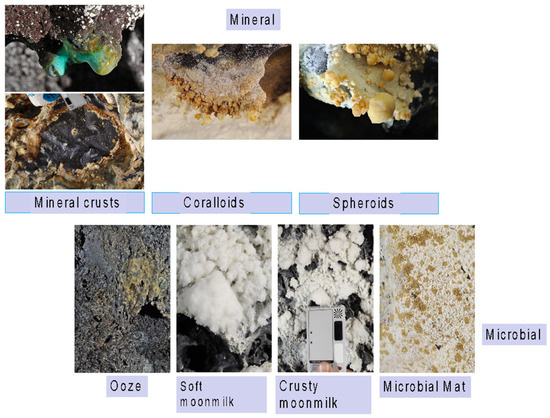 Microbial ecological exploration of lava caves evolved beyond the highly colorful and visible microbial mats to include secondary mineral growths, e.g., mineral crusts and coralloids. These morphology types are common in caves worldwide and are frequently found in lava tubes as well as other cave types [10]. A growing number of cave studies using a variety of techniques, including DNA sequencing and scanning electron microscopy (SEM) imaging, have shown that such secondary cave features harbor a diverse assortment of microorganisms. These studies have investigated silicified microbial morphologies in various secondary minerals such as coralloids [11,12,13], while other investigations of microbial diversity in lava caves included a study of sediment from Mt. Erebus, Antarctica [14]; coralloid, crusts, and moonmilk from the Galapagos Islands, Ecuador [15]; opaline stromatolites in Mexico [16]; ooze, microbial mats, and moonmilk from the Canary Islands, Spain [17]; and a variety of secondary mineral deposits in Craters of the Moon National Monument and Preserve, USA [18]. Together, these studies are starting to paint a picture of the incredible diversity of organisms in lava caves and beginning to elucidate the roles these organisms play in the cave ecosystem, especially in the creation of secondary mineral deposits. Few studies, however, have investigated multiple morphology types from a single cave.