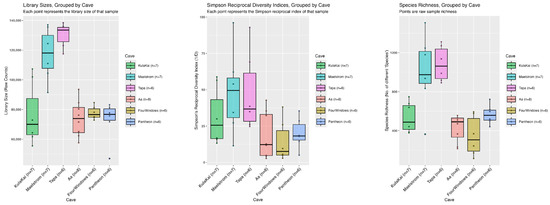 Alpha diversity, by cave. Representations of library size, species richness, and inverse-Simpson diversity. Box plots represent medians, as well as all four quartiles.