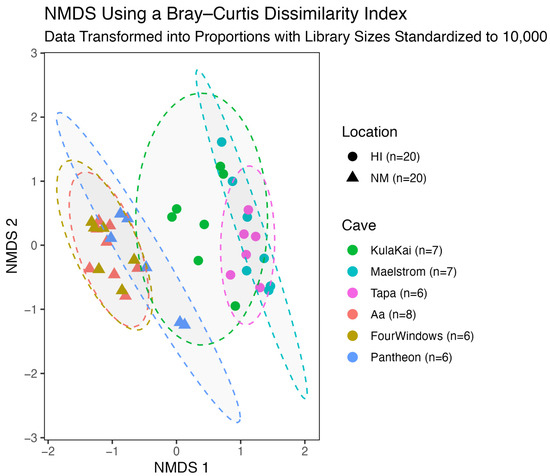 Non-Metric Multidimensional Scaling (NMDS) analyses revealed a clear separation between the lava caves of Hawai`i and New Mexico (Figure 3). According to McCune and Grace [48], NMDS should be the go-to beta diversity ordination for ecologists. When these data were analyzed by cave, Hawai’i and New Mexico caves had separate centroids. Similar to observations made in our alpha diversity analysis, Kula Kai stands out from the rest of the Hawaiian caves. Kula Kai overlaps slightly with New Mexico samples but does so, more extensively, with the Hawaiian samples. The four samples from Kula Kai do not group with Hawaiian or New Mexican samples. Instead, they are found to reside between the two locations (Figure 3). The sample types of those outliers are moonmilk, a mineral crust, a microbial mat, and a coralloid. The samples from Kula Kai that are well within the Hawai`i groupings are two spheroids and an ooze.