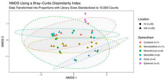 We confirmed that both locations (Hawai`i and New Mexico) were significantly different by establishing a Bray–Curtis dissimilarity matrix, thus allowing for statistical hypothesis testing. Applying a permutational analysis of variance (PERMANOVA) [37] showed that the two locations were significantly different from one another (p < 0.05) (Figure 3). Additionally, if we apply the same PERMANOVA to analyze the difference between speleothems, we obtain a variety of results (Figure 4). However, the more curious results are that mineral crusts are not significantly different from any of the speleothems, with the exception of spheroids, which are significantly different from all other speleothems.