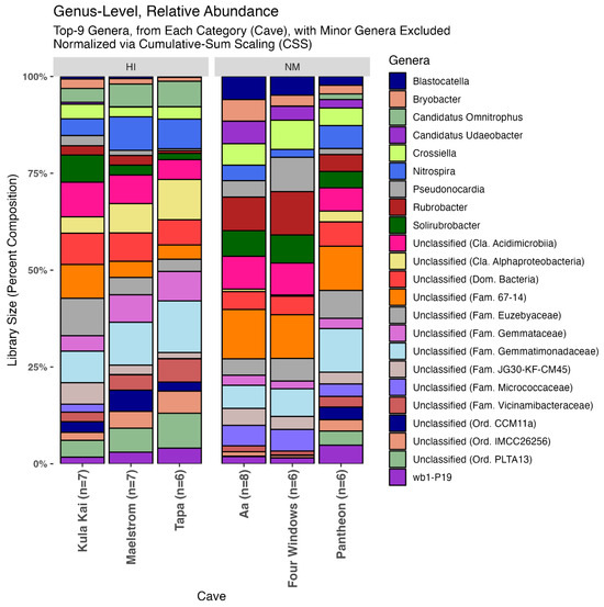 Bacterial relative abundance by cave and location. The top nine bacterial genera by cave, with the three Hawaiian caves on the left and the three New Mexican caves on the right.