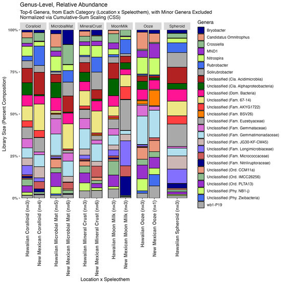Additionally, there are some differences among speleothems depending on where they come from (Figure 6). Coralloid microbial composition differs between Hawai`i and New Mexico, in that Hawaiian samples contained Candidatus Omnitrophus, CCM11a, and NB1-j. Additionally, the bacterial analysis of Hawaiian coralloids had more abundant Nitrospira, unclassified Alphaproteobacteria, Gemmataceae, and Longimicrobiaceae than New Mexican coralloids. Meanwhile, New Mexican coralloids were more abundant in Rubrobacter, 67-14, and JG30-KF-CM45 than Hawaiian coralloids.