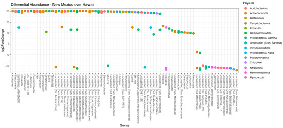 Differential abundance analysis. The output is New Mexico over Hawai`i, a positive log2 fold change output indicates high differential abundance in New Mexico, and a negative log2 fold change output indicates low differential abundance in New Mexico. Each point represents a unique ASV. Colors are associated with phyla and the x-axis is genera.