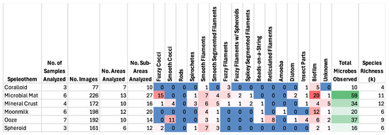 Number of observations of different microbial morphologies across different sample types. “Number of Samples Analyzed” is a reference to the number of cave features placed under the SEM. “Number of Images” references the sum total of different scanning electron micrographs taken for all samples analyzed. The data are represented in two different heat maps. The microbial morphologies are color coded with dark blue representing extremely low numbers observed, and dark red representing high abundance; white is the intermediate. Sample size goes from white, representing a low number of samples analyzed, to dark green, representing a high number of samples analyzed.