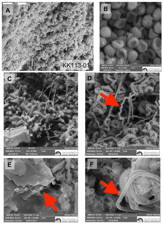 (A–F) SEM micrographs of various microbial morphologies found in Hawaiian and New Mexican lava caves: (A) smooth filaments and smooth cocci microbes, (B) “fuzzy” cocci, (C) fuzzy filaments, (D) spiral bacteria (arrow), (E) beads-on-a-string and (F) reticulated filaments.
