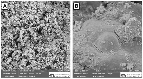Moonmilk appears in crusty and fluffy genres (Figure 15A,B), which were distinct under SEM. Fluffy moonmilk exhibited long, calcitic rod-like minerals, whereas crusty moonmilk was composed of sharp, knife-like crystals among filamentous detritus. Microbes and biofilms were plentiful within fluffy moonmilk samples. Both New Mexican and Hawaiian moonmilk samples consist of calcium carbonate.