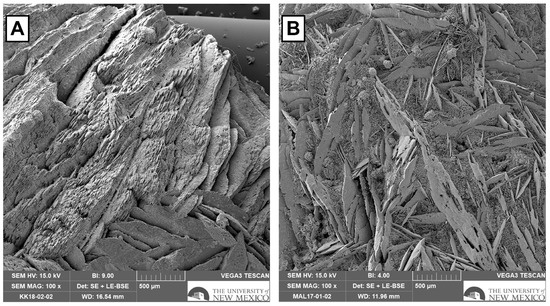 (A,B) Various forms of moonmilk under SEM. (A) Crusty moonmilk from New Mexico. (B) Fluffy moonmilk from Hawai`i. Both consist of thin and rod-like CaCO3 crystals, but the crusty moonmilk tends to have morphologically robust crystals whereas the fluffy moonmilk largely consists of needle fiber calcite crystals [52,53].