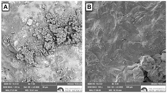 (A,B) SEM micrographs of the surface of coralloids. (A) Coralloid from Hawai`i with a “flakey” superficial mineral crust. (B) Coralloid from a New Mexican lava cave with both smooth and flakey areas.